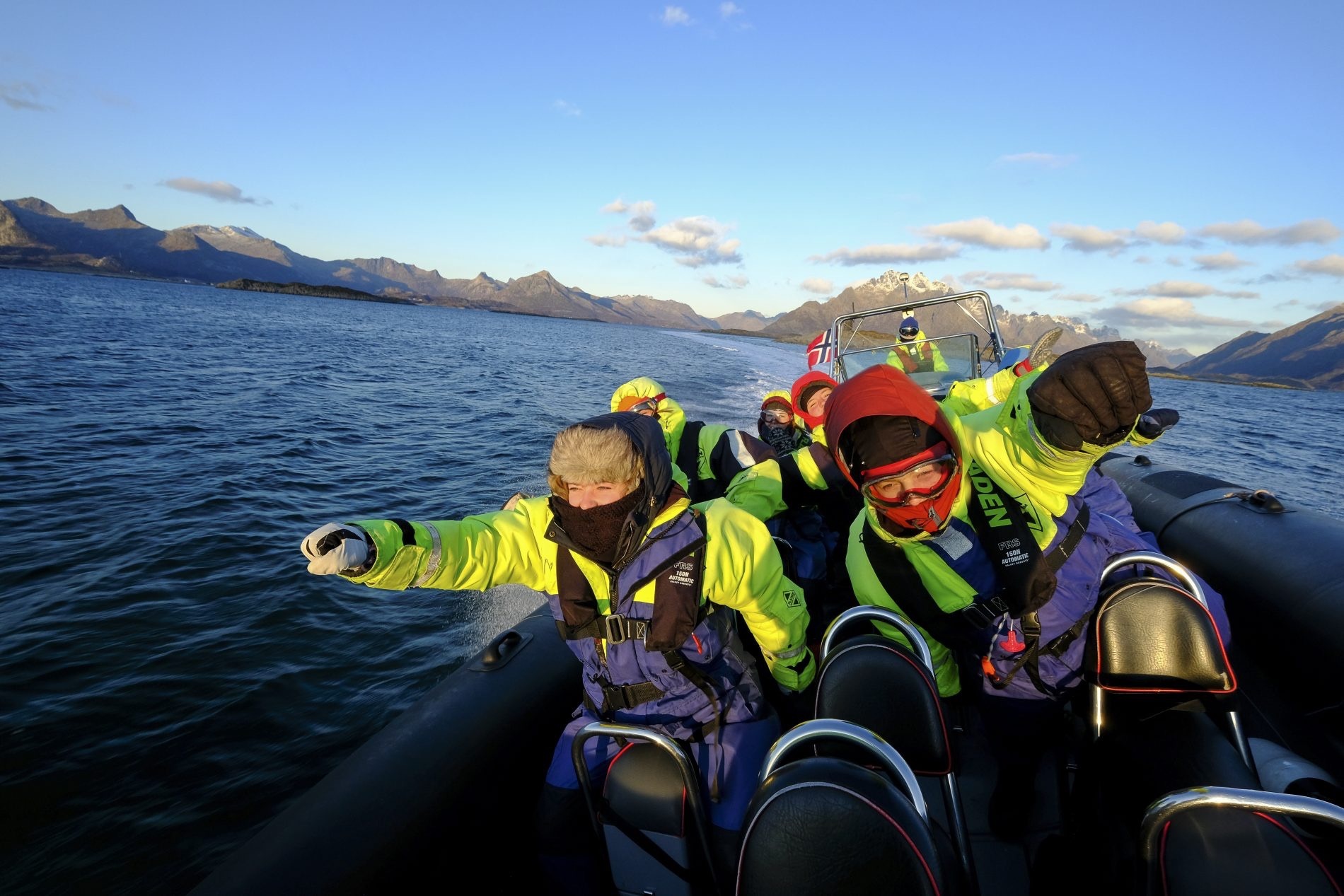 The tour takes place in the fjords near Narvik, close to the Swedish border. The area is known for its dramatic mountains rising straight from the sea and views toward the Frostisen glacier.
